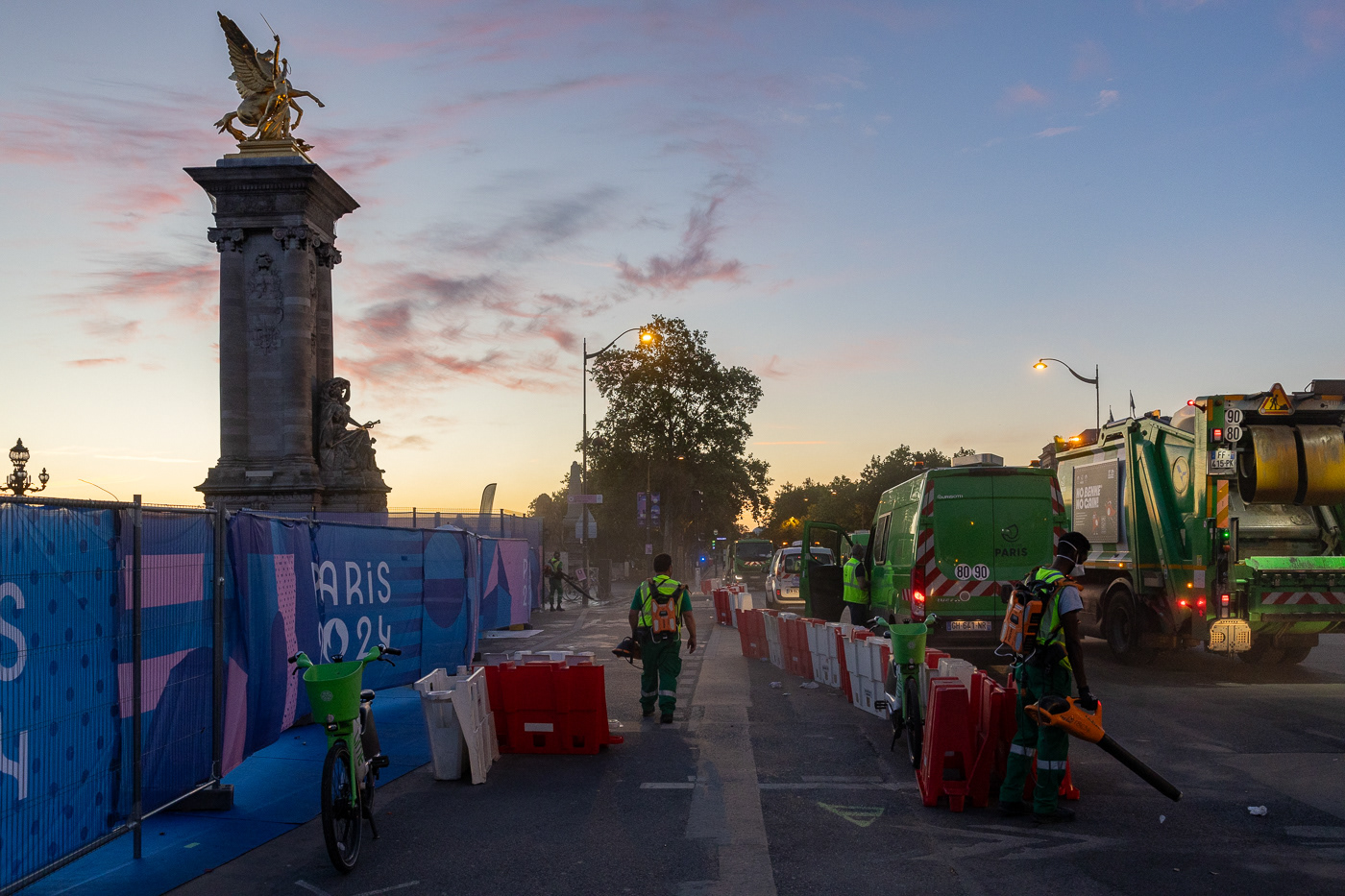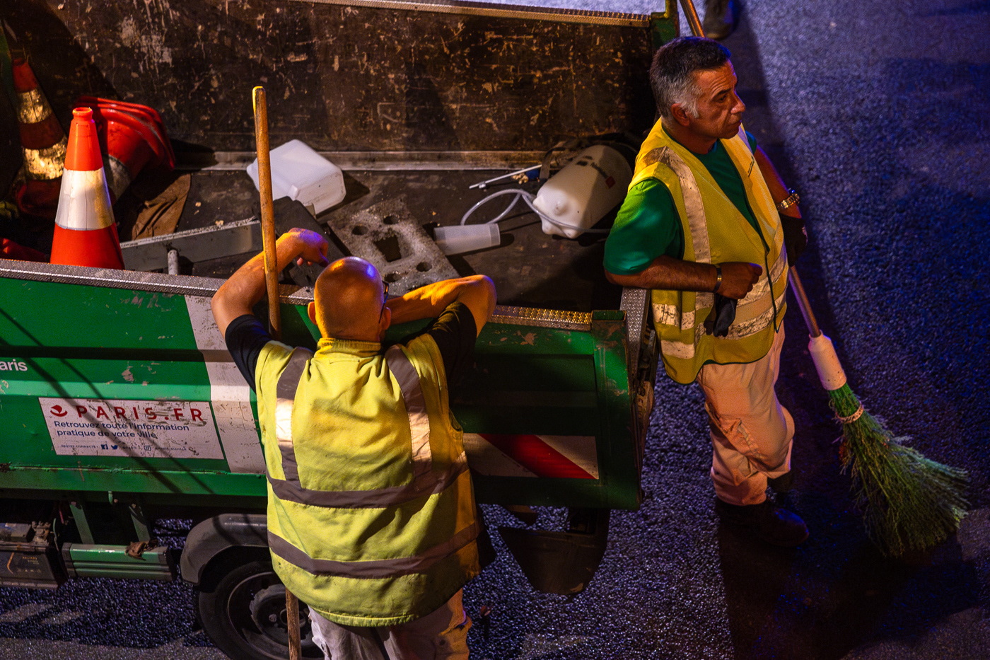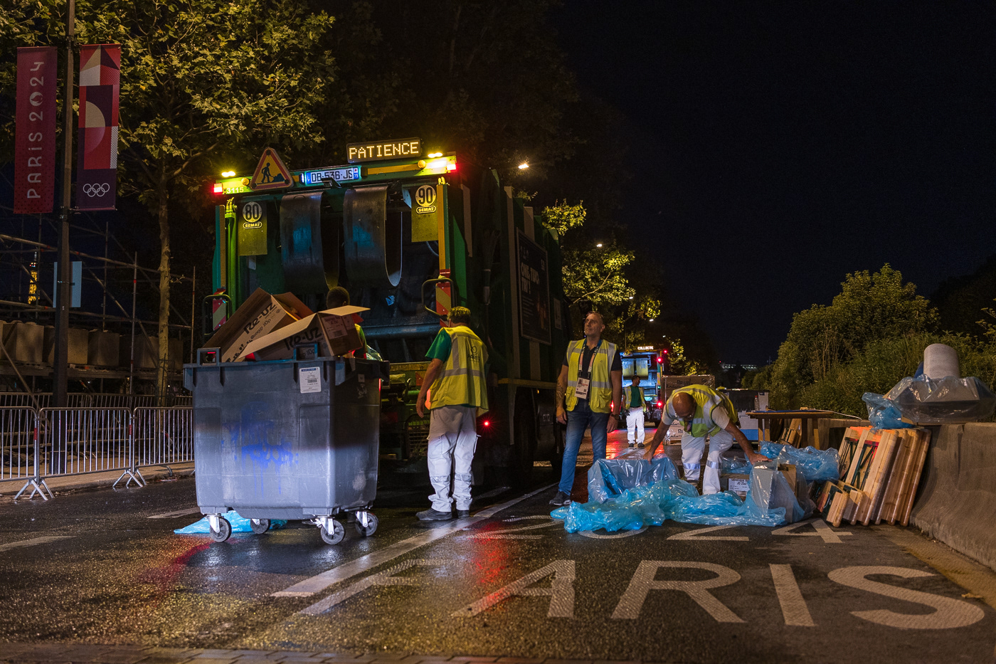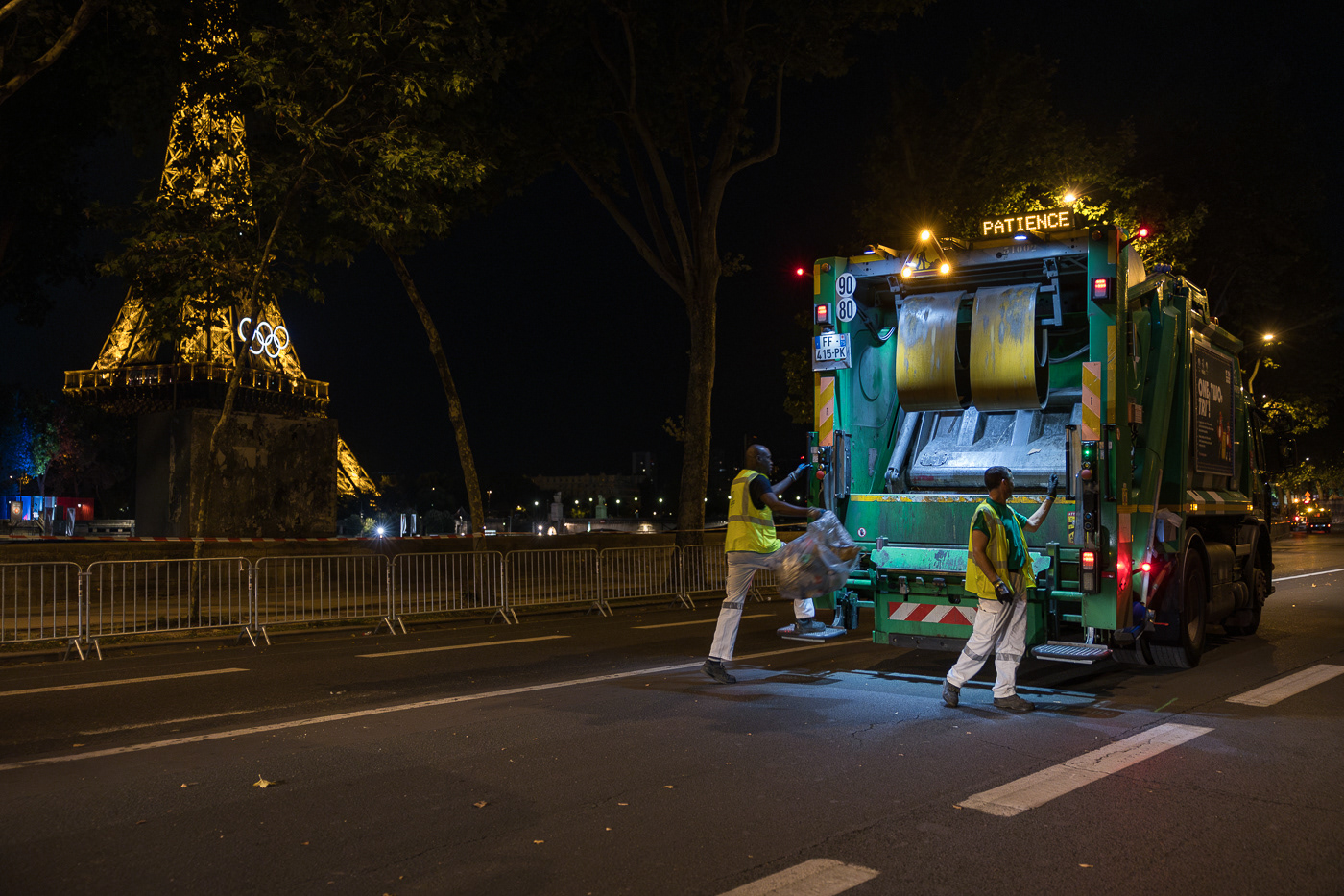 Avec la série “JO : les champions de l’ombre”, Anton Reyes révèle le travail invisible des éboueurs de nuit de Paris, en particulier celui de la Fonctionnelle, une brigade d’élite surnommée “GIGN de la Propreté”. Active 24h/24 et 7j/7, cette unité d’intervention couvre des opérations sensibles, là où les équipes classiques du STPP (Service Technique de Propreté de Paris) ne peuvent se rendre : nettoyage post-manifestations, entretien nocturne du périphérique, nettoyage des grands marchés ou encore de zones plus sensibles comme les camps de migrants démantelés ou les accidents de la route. Pour ce projet, le photographe a suivi l’équipe de nuit de la Fonctionnelle lors d’un événement d’une envergure exceptionnelle : les Jeux Olympiques de Paris 2024. Pendant cette période, ces agents ont assuré des missions de maintien et de remise en propreté autour des sites olympiques, et en particulier la préparation nocturne des voies publiques avant le départ d’épreuves comme le marathon ou le cyclisme. Dans les coulisses de cet événement spectaculaire et ultra médiatisé, l’équipe de nuit a travaillé dans l’urgence et la discrétion, permettant aux spectateurs et aux athlètes de vivre les Jeux dans les meilleures conditions. A travers ces images, Anton Reyes rend hommage aux agents en uniformes verts présents dans cet espace-temps nocturne ambigu où le temps semble à la fois suspendu et fuyant. Malgré l’épuisement et l'invisibilité qui caractérisent leur travail, ces “champions de l’ombre” remplissent leur mission répétée nuit après nuit, accomplissant leur propre course contre la montre, jusqu’à l’aube et l’éveille de la ville.