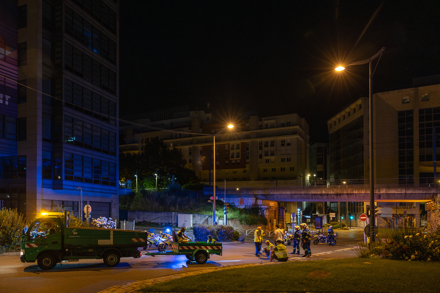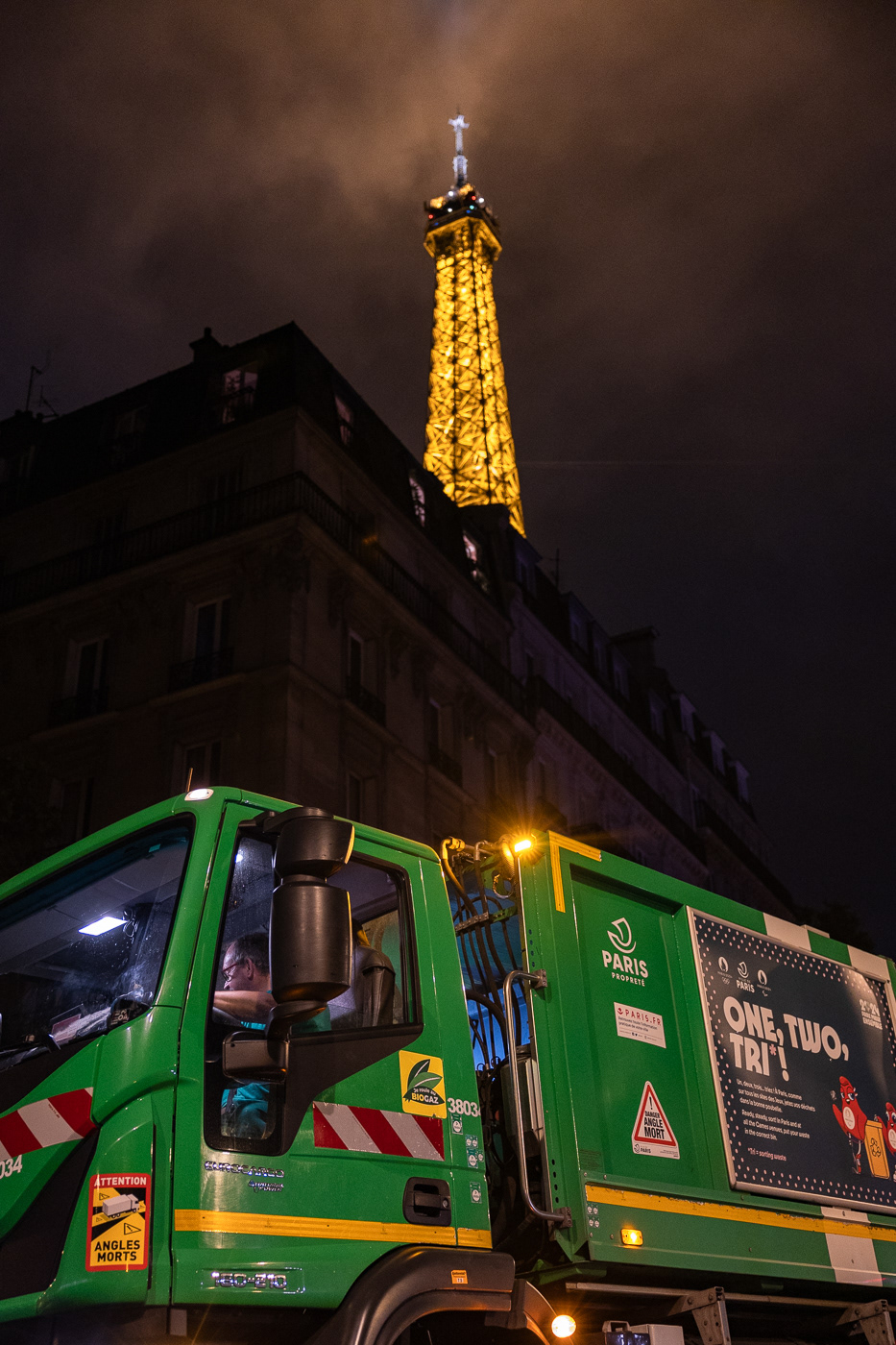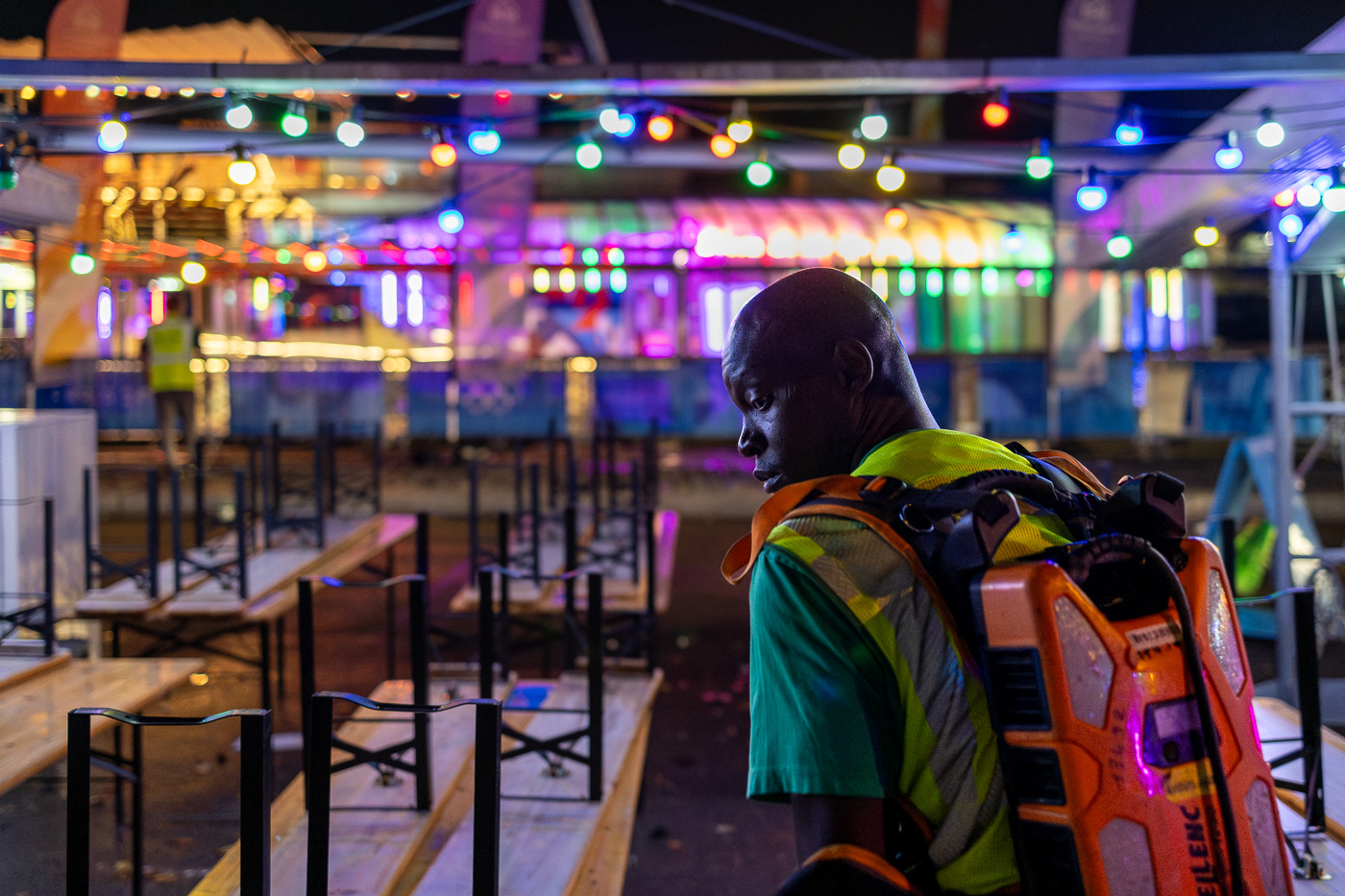 Avec la série “JO : les champions de l’ombre”, Anton Reyes révèle le travail invisible des éboueurs de nuit de Paris, en particulier celui de la Fonctionnelle, une brigade d’élite surnommée “GIGN de la Propreté”. Active 24h/24 et 7j/7, cette unité d’intervention couvre des opérations sensibles, là où les équipes classiques du STPP (Service Technique de Propreté de Paris) ne peuvent se rendre : nettoyage post-manifestations, entretien nocturne du périphérique, nettoyage des grands marchés ou encore de zones plus sensibles comme les camps de migrants démantelés ou les accidents de la route. Pour ce projet, le photographe a suivi l’équipe de nuit de la Fonctionnelle lors d’un événement d’une envergure exceptionnelle : les Jeux Olympiques de Paris 2024. Pendant cette période, ces agents ont assuré des missions de maintien et de remise en propreté autour des sites olympiques, et en particulier la préparation nocturne des voies publiques avant le départ d’épreuves comme le marathon ou le cyclisme. Dans les coulisses de cet événement spectaculaire et ultra médiatisé, l’équipe de nuit a travaillé dans l’urgence et la discrétion, permettant aux spectateurs et aux athlètes de vivre les Jeux dans les meilleures conditions. A travers ces images, Anton Reyes rend hommage aux agents en uniformes verts présents dans cet espace-temps nocturne ambigu où le temps semble à la fois suspendu et fuyant. Malgré l’épuisement et l'invisibilité qui caractérisent leur travail, ces “champions de l’ombre” remplissent leur mission répétée nuit après nuit, accomplissant leur propre course contre la montre, jusqu’à l’aube et l’éveille de la ville.